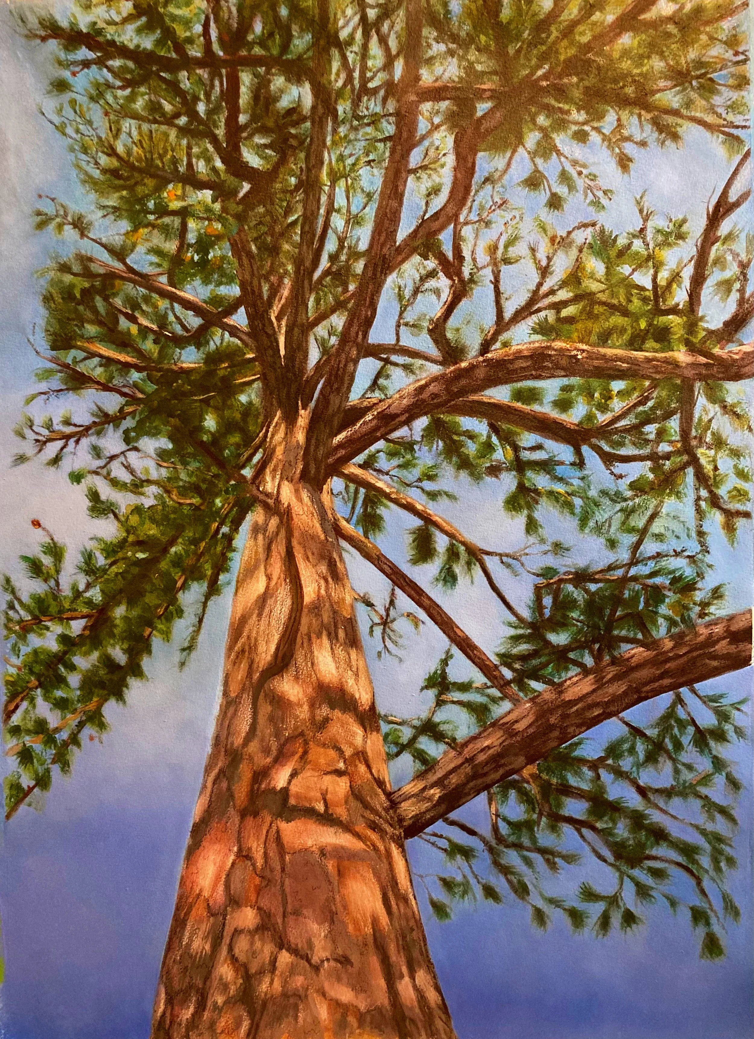 20 x 27 mixed media on cold pressed water color paper. The bark of the Jeffrey Pine is jigsaw puzzle joy. $383.00