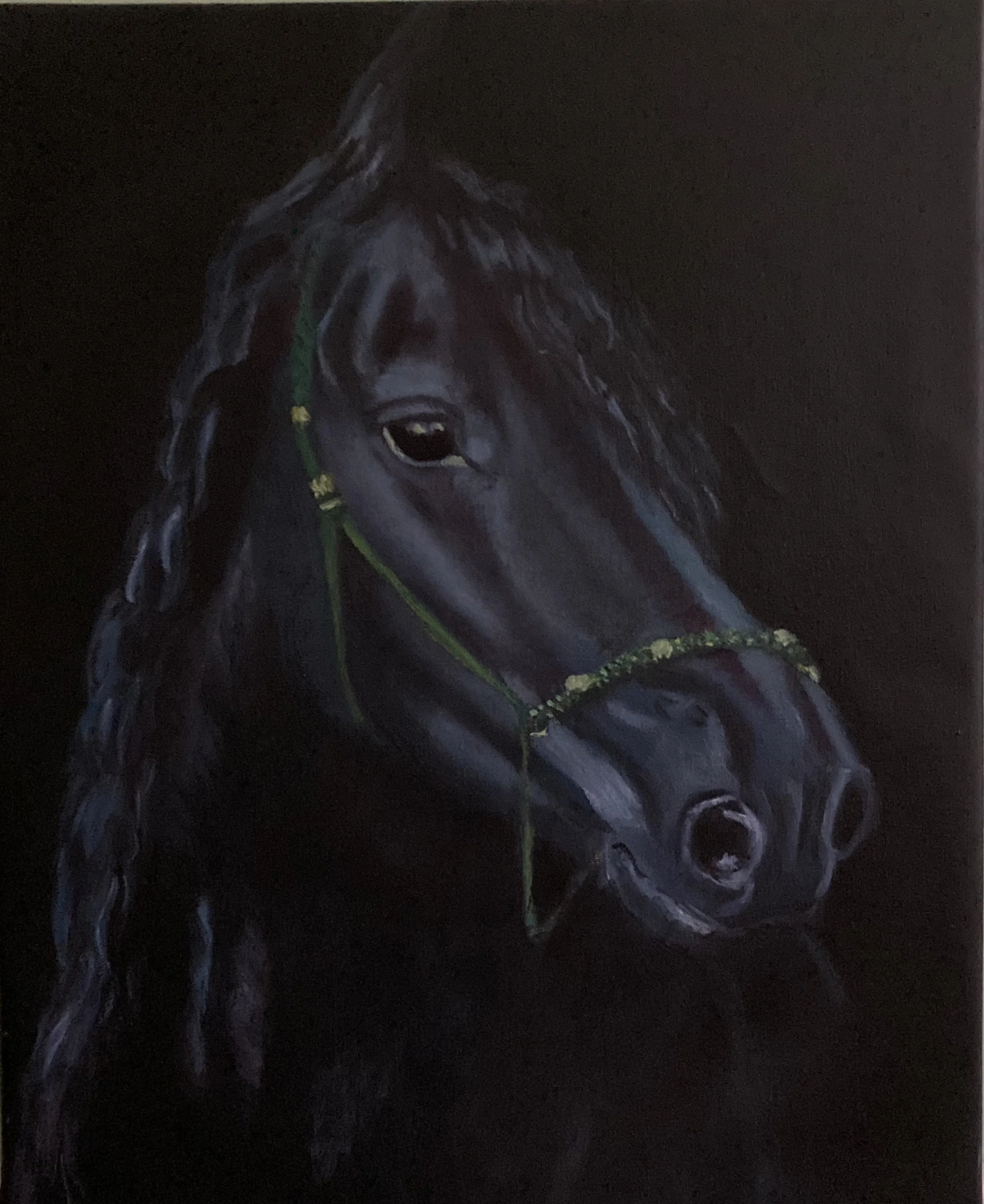 Our task was to learn how to render dark pigments effectively, to be explicit about the nuanced types of black available to us in oil paint, and to exploit their chemical properties to deliver the most convincing shadows, background versus foreground. My first attempt was unsuccessful in my view, but this one turned out better I think. This blue beauty feels soulful to me, like all horses.